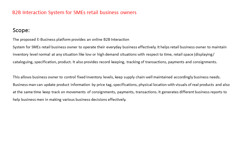 System for SMEs retail business owner to operate their everyday business effectively. It helps retail business owner to maintain inventory level normal at any situation like low or high demand situations with respect to time, retail space (displaying/ cataloguing, specification, product. It also provides record keeping, tracking of transactions, payments and consignments.