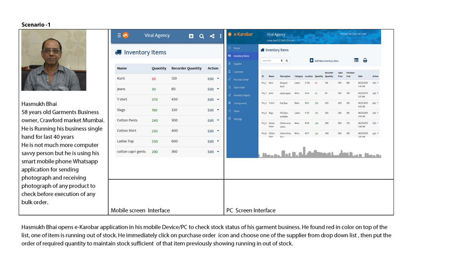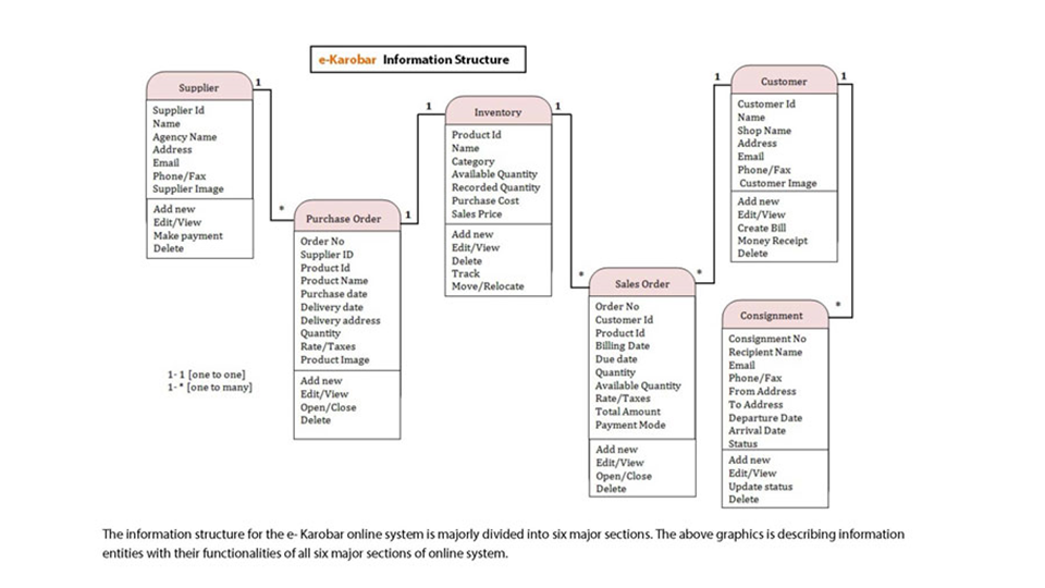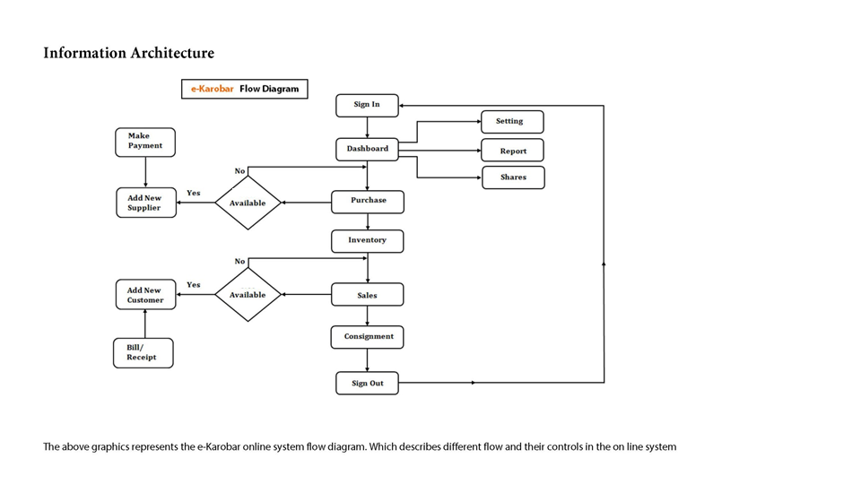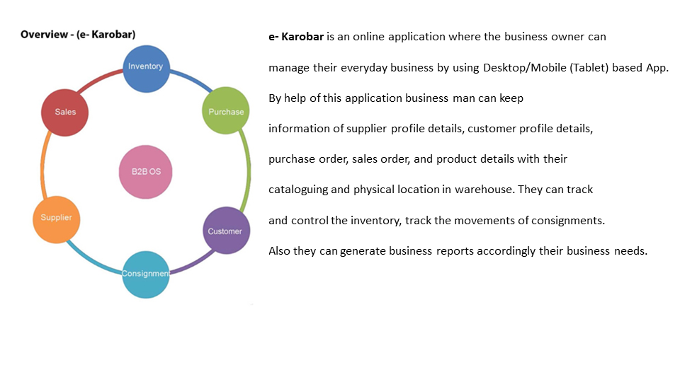 The final concept e-Karobar is an online application where the retail business owners can manage their everyday business by using Desktop PC/Mobile Devices . This allows business owners to control fixed inventory levels, keep supply chain well maintained accordingly business needs. Business men can update product information by
