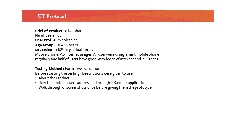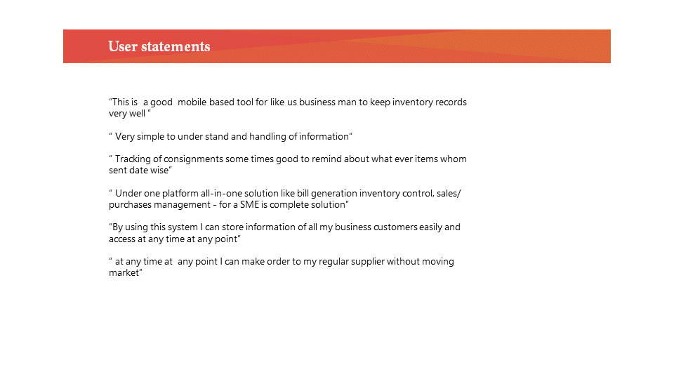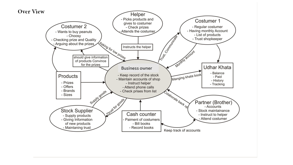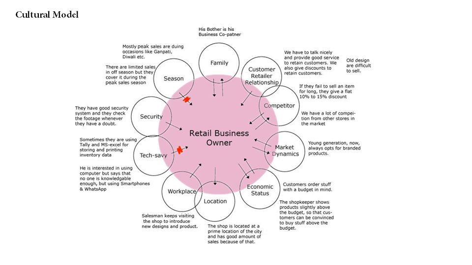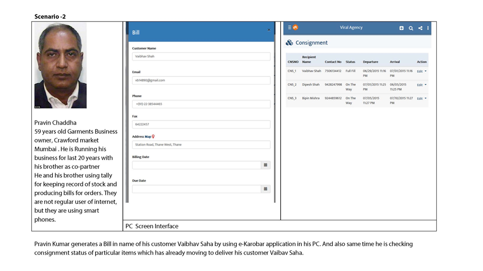 Initially, Contextual Enquiry was conducted with business owners in CrawfordMarket Mumbai area. Sample users were selected from five differentbusiness categories to get a good understanding of various business processes. After analysis, insights were drawn from this study to make the design brief.