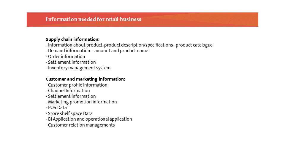 Adoption of different Information and communications technology (i.e. Barcode and Scanners, E-Commerce, Mobile POS, Cloud computing, Intelligent database(AI), Electronic Data Interchange etc. )