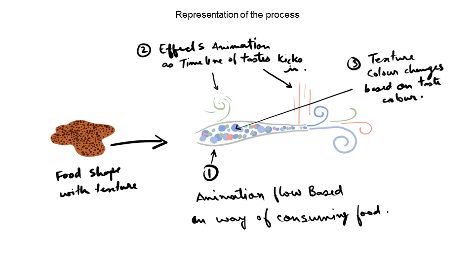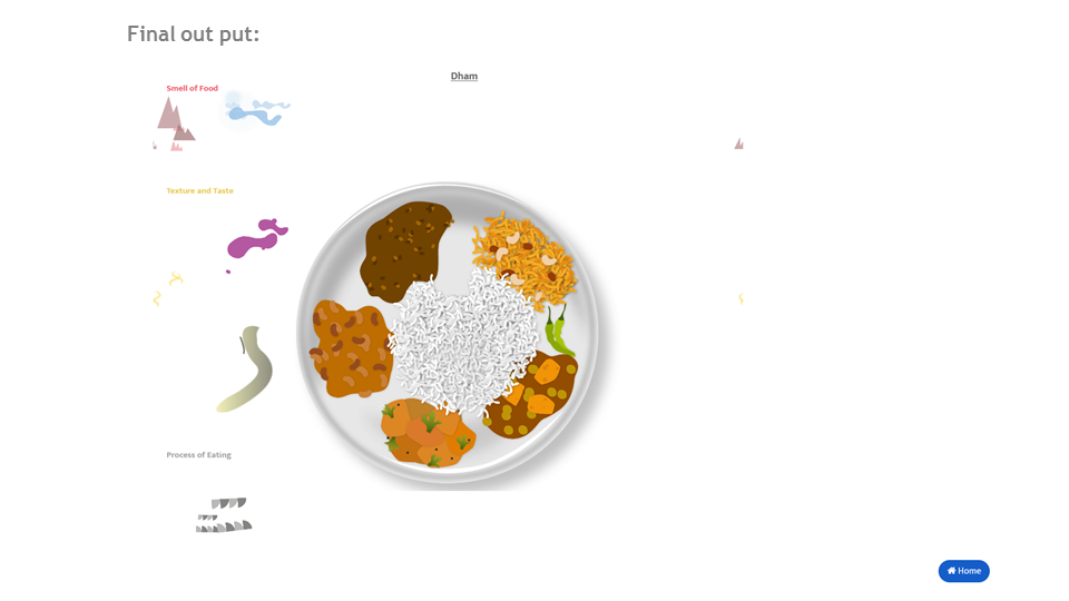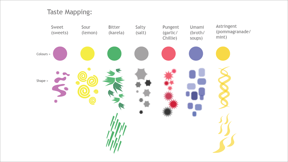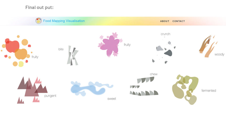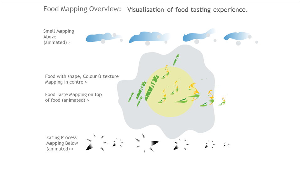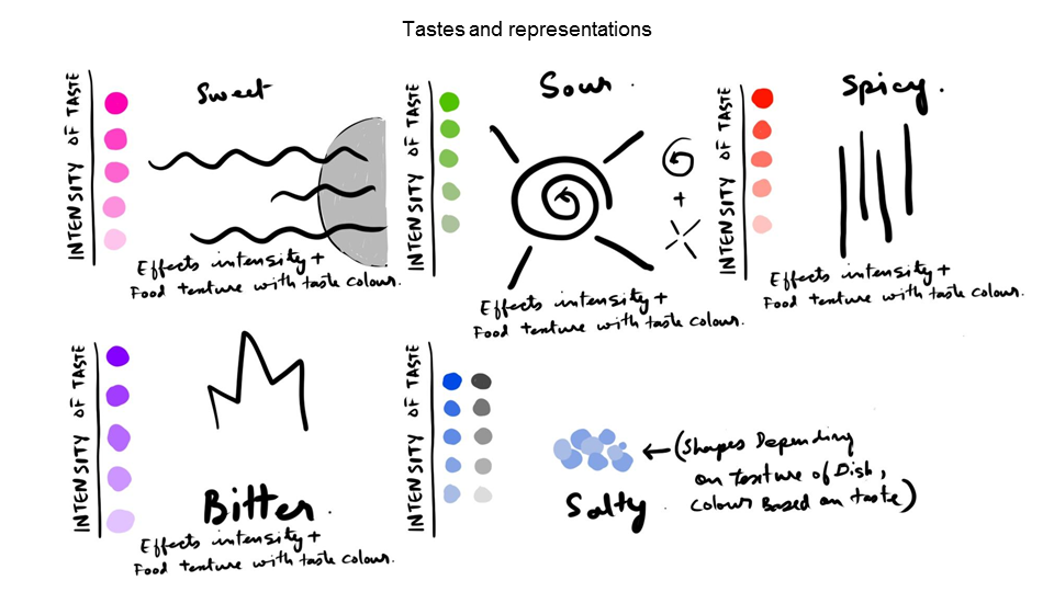 The visualisation aims to map the following aspects of food - its taste, its smell, its colour, its texture and the process of eating food.
