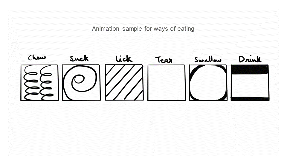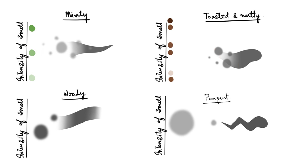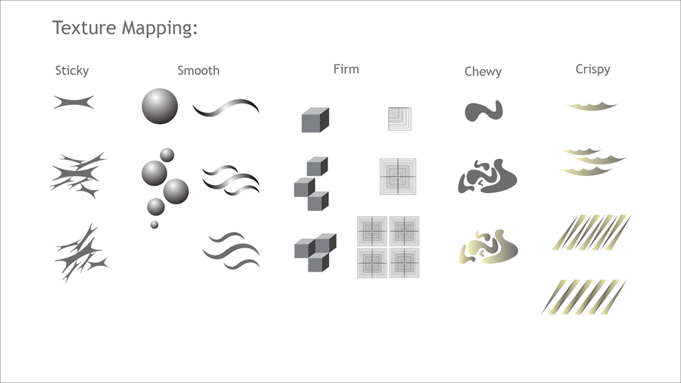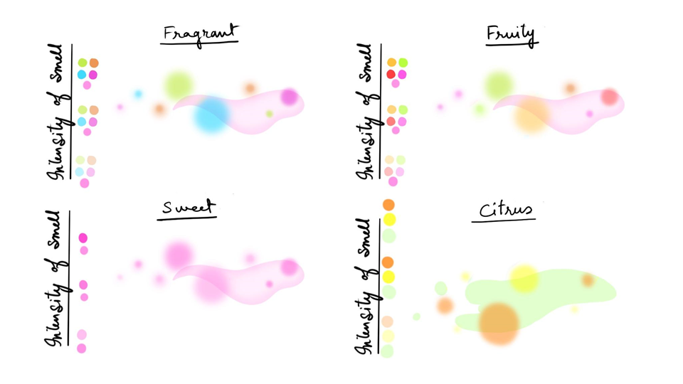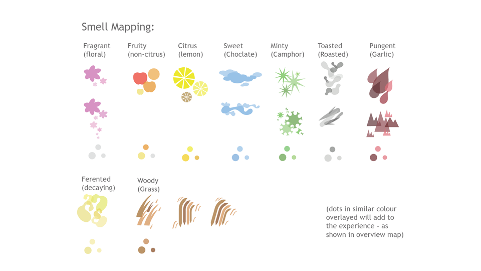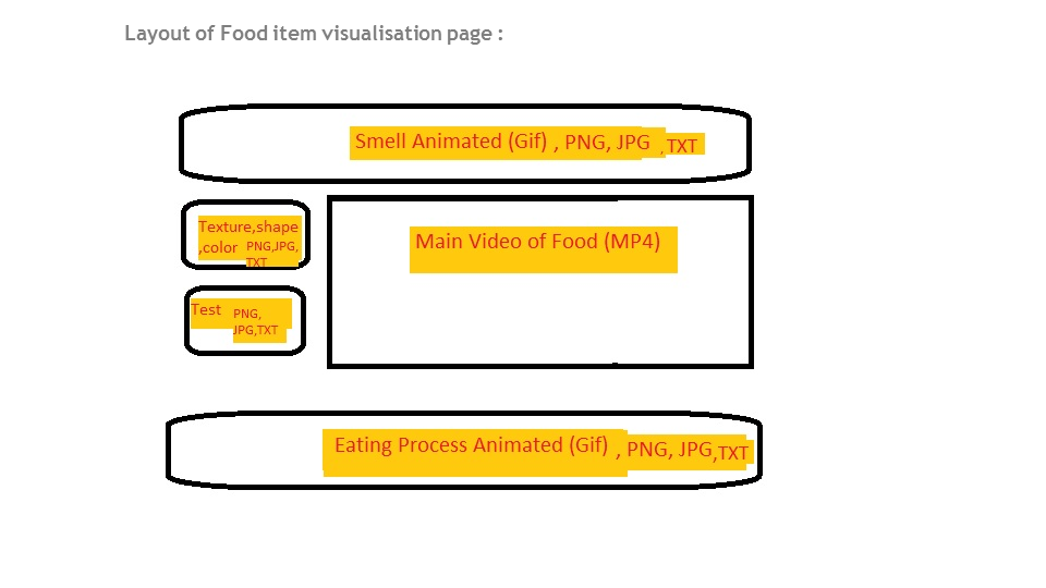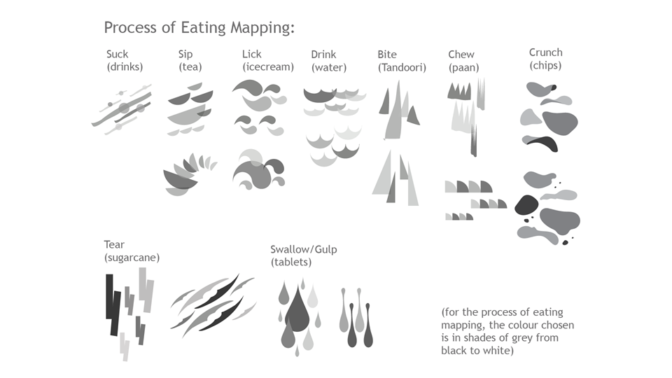 The visualisation aims to map the following aspects of food - its taste, its smell, its colour, its texture and the process of eating food.