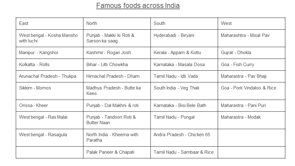 For this project, we have chosen food from different parts of our country - food from east, food from north, food from south and food from west.
