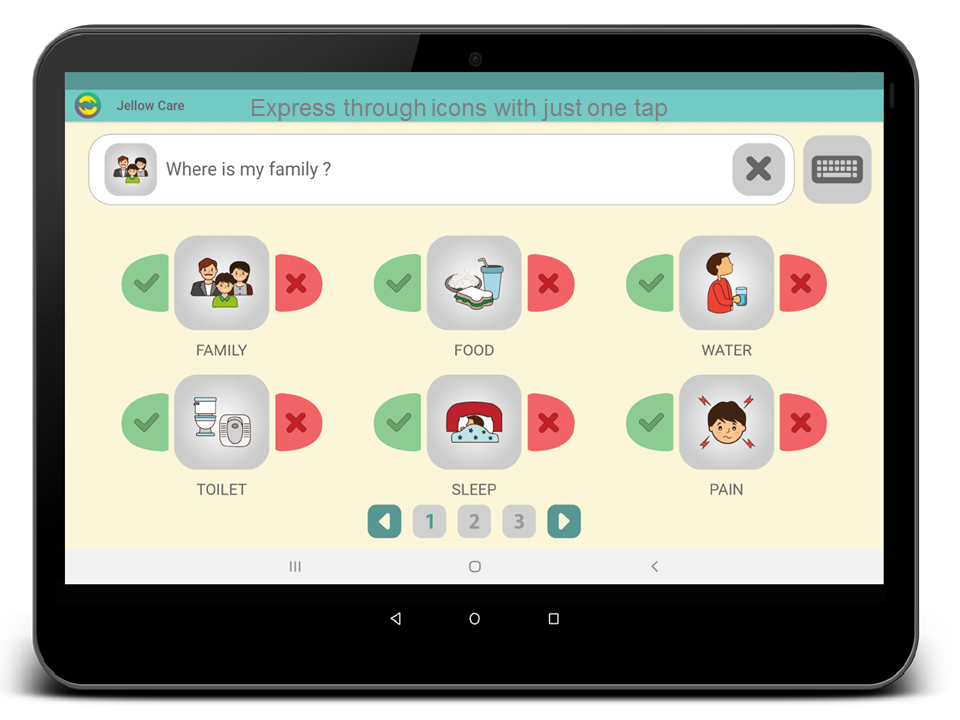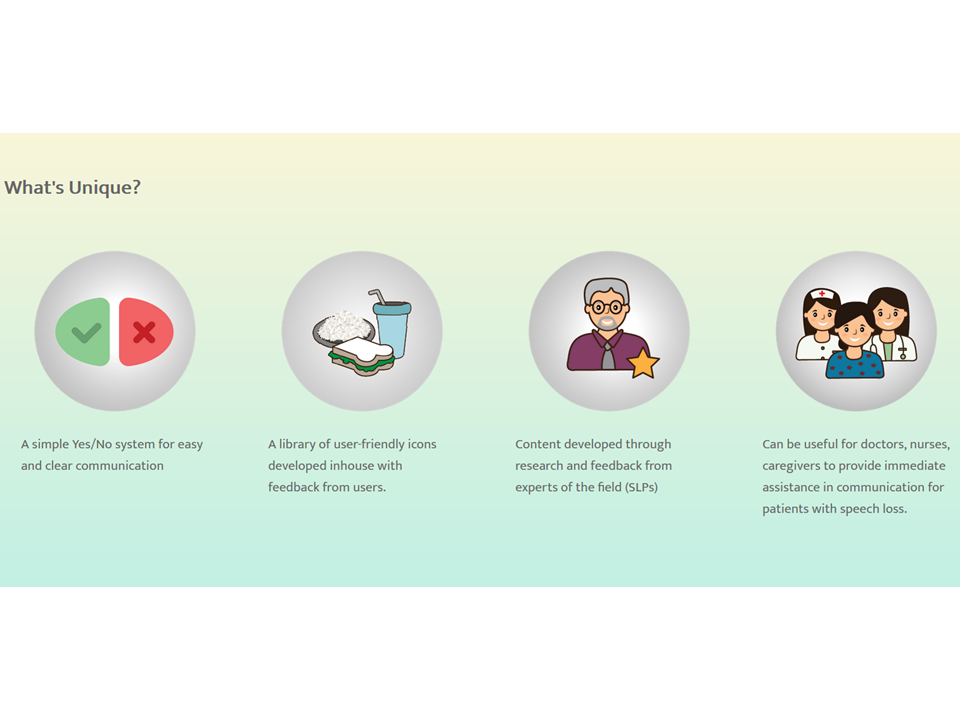 This application provides predefined expressive sentences that can be used by patients (Stroke & Aphasia) to communicate during their stay at the hospital and also during their recovery at home. Moreover, this application allows a simple yes or no, single touch communication which makes it easier to bridge the communication gap between the patient and their caregiver, as the patient can convey their needs effectively.