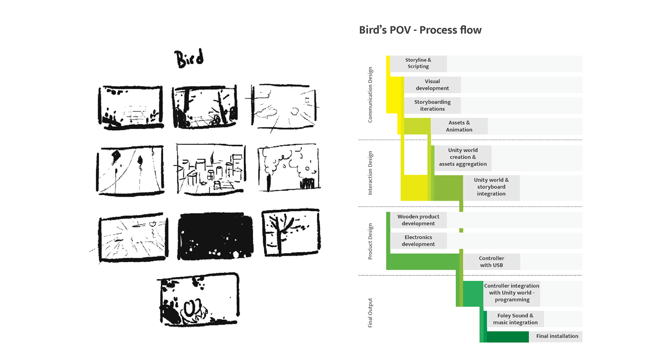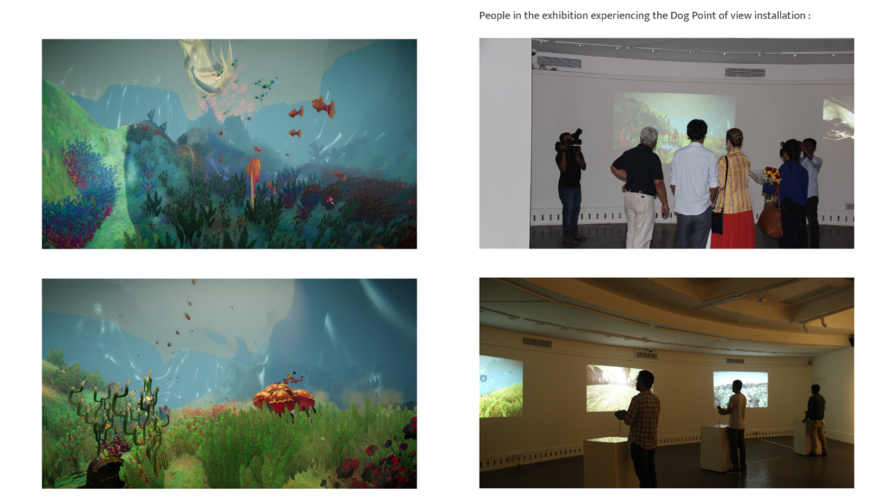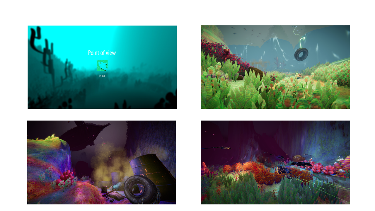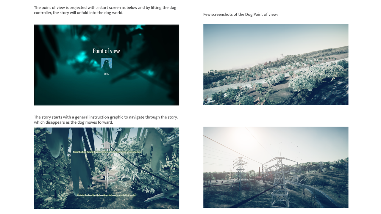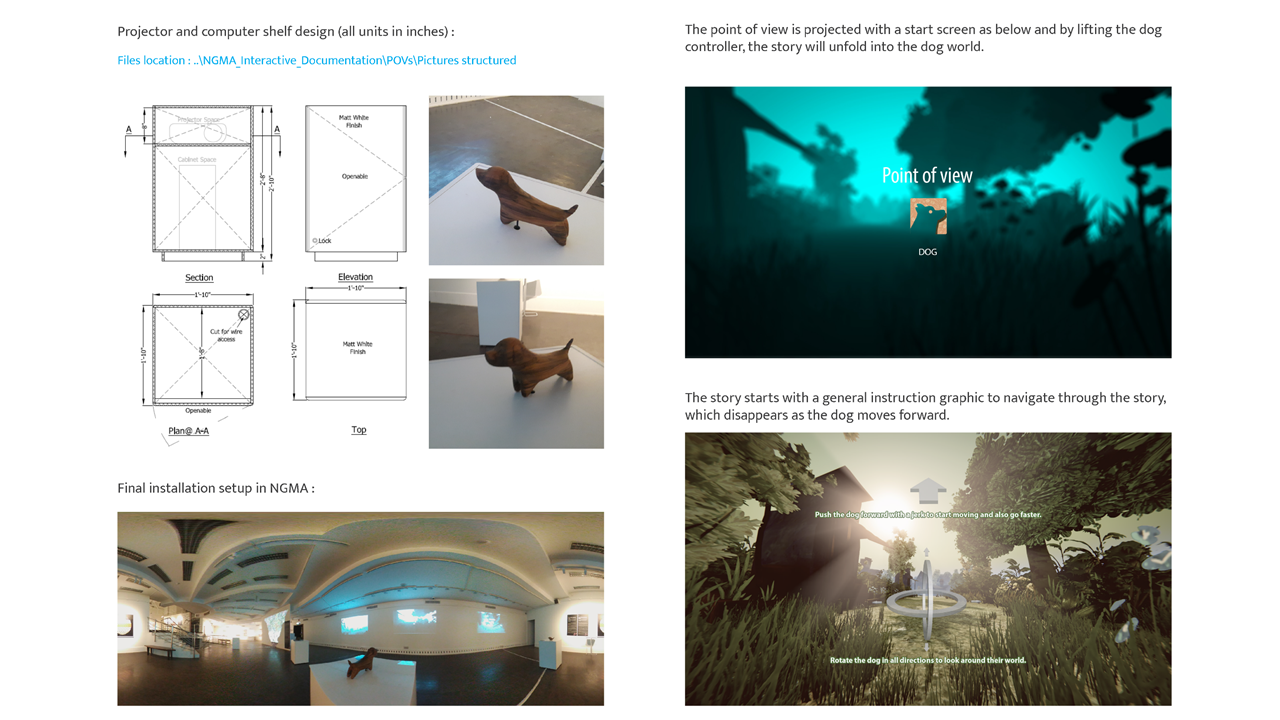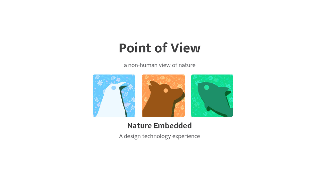 Point of view (POV) is an interactive wall pro-jection installation, in which the user can experience a certain character’s view of the world around them.Through this installation we give a glimpse of how differ-ent animals actually perceive their surroundings taking into consideration on their eye level, visual color palette, speed of their actions, etc. For this installation experiment to have a diverse visual experiences, three specific species were taken into ac-count, having three distinct visual point of view scenari-os: land point of view, aerial point of view and underwa-ter point of view.