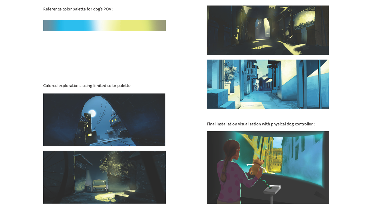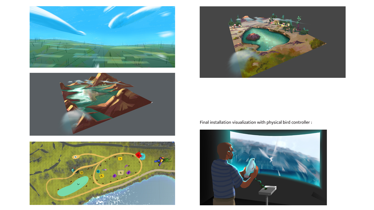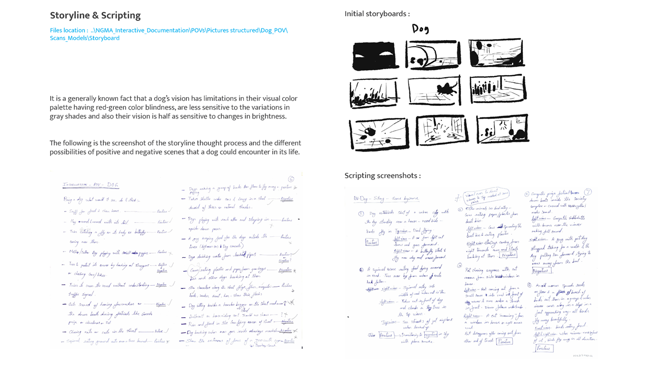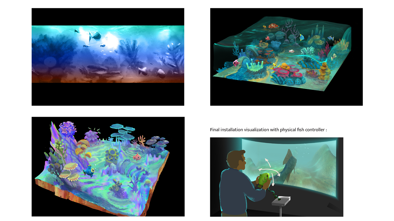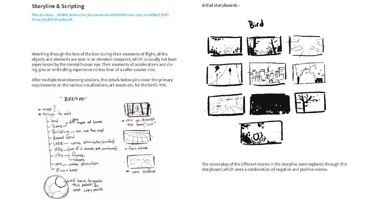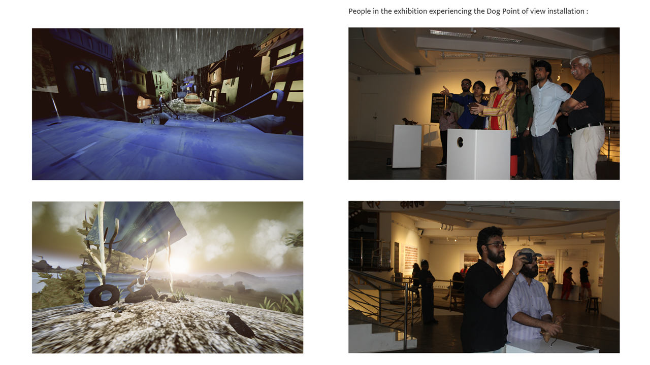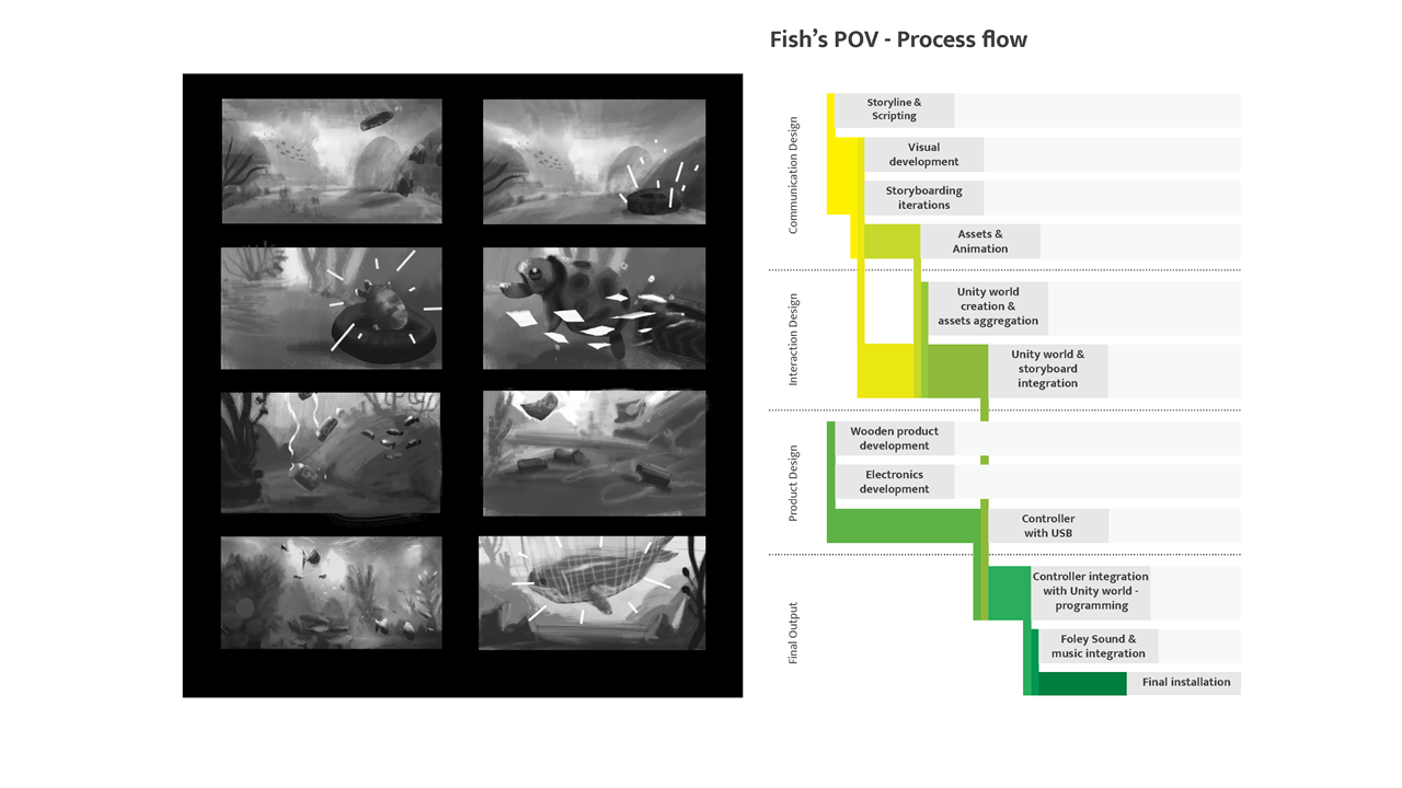 Point of view (POV) is an interactive wall pro-jection installation, in which the user can experience a certain character’s view of the world around them.Through this installation we give a glimpse of how differ-ent animals actually perceive their surroundings taking into consideration on their eye level, visual color palette, speed of their actions, etc. For this installation experiment to have a diverse visual experiences, three specific species were taken into ac-count, having three distinct visual point of view scenari-os: land point of view, aerial point of view and underwa-ter point of view.